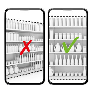 Positioniere dich direkt vor dem Regal. Achte darauf, dass die Kamera exakt ausgerichtet ist und in einem 90-Grad-Winkel entweder vertikal oder horizontal zum Regal steht.