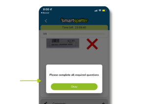Some questions are mandatory during SmartSpotter checks, so you must complete all of them to complete a spot. If you are trying to submit a spot but have not answered any of the mandatory questions, a message will pop up asking you to complete all required questions.