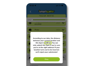 SmartSpotter wants to ensure the assignment is carried out at the right location and will reject spots too far away from the given area. That is why you must submit it right on the spot!