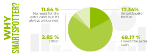 We also wanted to ask Spotters why they are part of our community. For the most part (68.17%), Spotters work with us because they need the extra cash, while 17.34% consider Smartspotter a fun way to earn money.