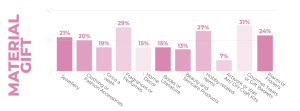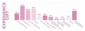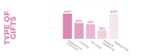 Experiences & Services and Material Gifts shared the top spot at 44% each. Gourmet Treats or Gift Baskets (30%) led material gifts, while Food/Dinner experiences were the preferred choice (41%) among experience gifts.
